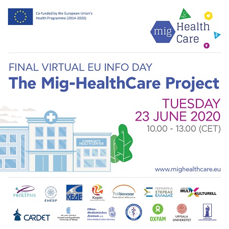 Το Ινστιτούτο Prolepsis διοργανώνει στις 23 Ιουνίου , ώρα 11:00 – 14:30 (10:00 – 13:30 CET) διαδικτυακή ημερίδα στο πλαίσιο της ολοκλήρωσης του προγράμματος Mig-HealthCare. Στην ημερίδα θα συμμετέχουν εκπρόσωποι από την Ευρωπαϊκή Επιτροπή, τον Παγκόσμιο Οργανισμό Υγείας και επιστημονικούς οργανισμούς από περισσότερες από 10 Ευρωπαϊκές χώρες.