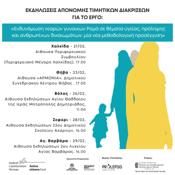 Το Ινστιτούτο Prolepsis και το Εργαστήριο Διαπολιτισμικής Αγωγής του Παιδαγωγικού Τμήματος Δευτεροβάθμιας Εκπαίδευσης του ΕΚΠΑ διοργανώνουν σειρά εκδηλώσεων το τελευταίο δεκαήμερο του Φεβρουαρίου, για την αναγνώριση της συμβολής των γυναικών Ρομά στο έργο «Ενδυνάμωση νεαρών γυναικών Ρομά σε θέματα υγείας, πρόληψης και ανθρωπίνων δικαιωμάτων». Οι εκδηλώσεις θα πραγματοποιηθούν στις περιοχές παρέμβασης του έργου και συγκεκριμένα σε: Χαλκίδα (21/2), Θήβα (23/2), Βόλο (26/2), Ζεφύρι (28/2) και Αγία Βαρβάρα (29/2).