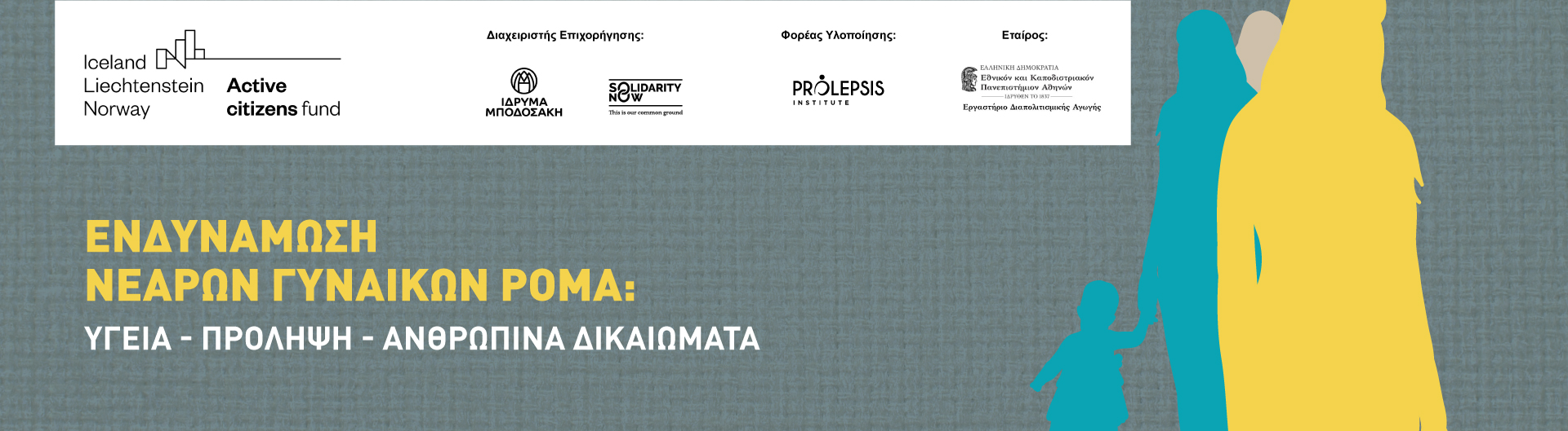 Το έργο «Ενδυνάμωση νεαρών γυναικών Ρομά σε θέματα υγείας, πρόληψης και ανθρωπίνων δικαιωμάτων: μία νέα μεθοδολογική προσέγγιση» υλοποιείται στο πλαίσιο του προγράμματος Active citizens fund, με φορέα υλοποίησης το Ινστιτούτο Prolepsis και εταίρο το Εργαστήριο Διαπολιτισμικής Αγωγής (Ε.Δ.Α) του Παιδαγωγικού Τμήματος Δευτεροβάθμιας Εκπαίδευσης του ΕΚΠΑ.